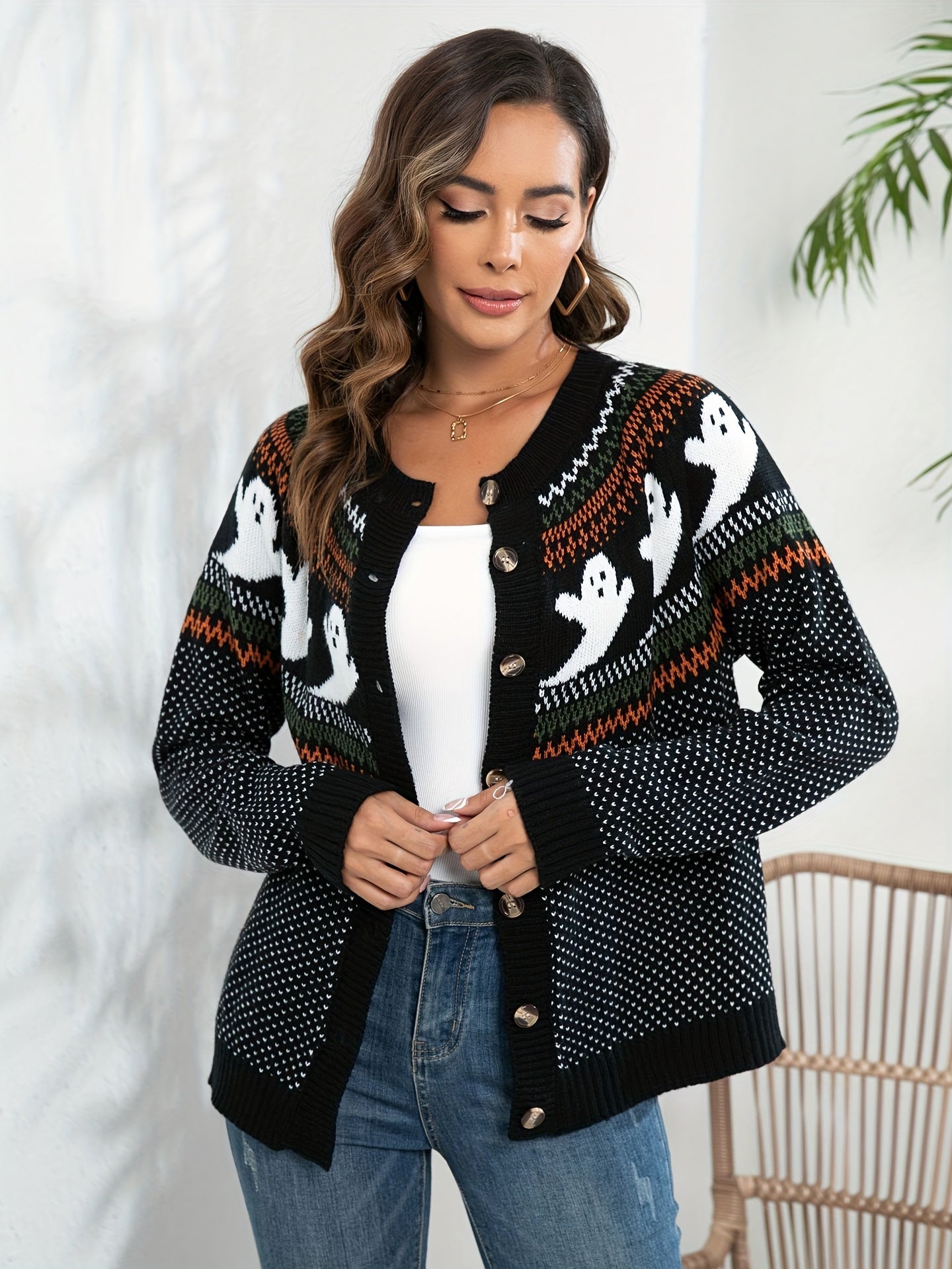Lang Gebreid Vest Dames – Halloween Vest met Knopen en Spookjesprint